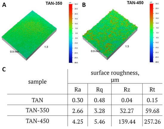 (A,B) Images of surface roughness of the samples measured from a selected area of the coatings (0.9 mm × 1.3 mm; magnification 5×), and (C) the results of the average measurements for each sample over selected areas of the coating surfaces.