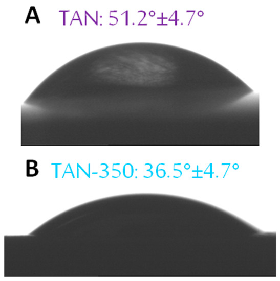 Contact angles of (A): TAN (B): TAN-350 samples
