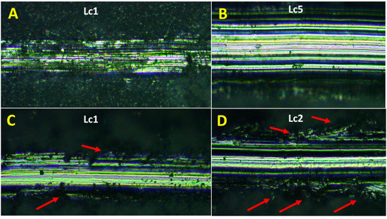 Adhesion of the coatings formed on biomedical TAN alloy was examined using the scratch testing method with a Rockwell indenter. The difference in the adhesion of the coatings is clearly seen in Figure 7. For the TAN-350 sample, five stages of coating delamination at various friction forces were observed: Lc1 was 3.12 N ± 1.84, Lc2 was 7.33 ± 4.26 N, Lc3 was 13.55 ± 2.55 N, Lc4 was 19.79 ± 4.08 N, and Lc5 was 27.83 ± 0.93 N. The first and the last stages of the scratch-testing measurements are respectively presented in Figure 7A,B. At the beginning and the end of the scratch test, no cracks in the coatings were observed. The coatings on the TAN-350 sample were more continuous than the coatings on the TAN-450 sample. Four stages of coating delamination were observed for the TAN alloy anodized at an increased voltage (450 V): Lc1 was 4.35 ± 0.45 N, Lc2 was 8.51 ± 4.59 N, Lc3 was 12.60 ± 0.91 N, and Lc4 was 12.72 ± 0.16 N. The differences are also clearly observed in the optical micrographs shown in Figure 7C,D. At the beginning, the changes in the coating were due to rapid delamination and changes in the interface between the indenter and coatings (marked by red arrows). The coatings were continuous at the bottom layers, and the indenter penetrated the coatings rapidly, changing the coating structure near the bottom (Figure 7D, red arrows).