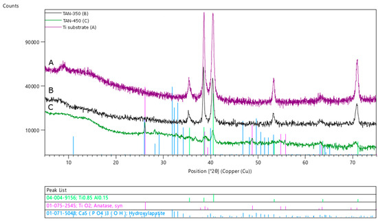 The Bragg peaks coming from the substrate (Ti-6Al-7Nb alloy) decreased when the thickness of the coatings increased. For the TAN-350 sample, the shapes of the peaks recorded for the substrate were extended on the right side, which may indicate that nonstoichiometric oxides were formed. No signals from the hydroxyapatite particles or other calcium phosphate compounds were found. In the XRD pattern of the TAN-350 sample (Figure 8B), the bump between the two angles 5° and 20° 2θ indicates that an amorphous phase was formed during the anodization process. This result was also due to spark discharges that occurred during the PEO process because some areas of the coatings were melted. For the TAN-350 sample the calcium and phorous compounds were incorpoated into the oxide layer (see Figure 3), but they were in amorphous form. The characteristic bump is larger for the TAN-450 sample (Figure 8C) due to the formation of thicker coatings at higher voltage. For the TAN-450 sample, the TiO2 phase was determined (anatase), and small peaks from the hydroxyapatite particles were observed. Not all the signals were clearly resolved, especially in the low 2θ region of the XRD pattern due to the formation of the amorphous phase. However, the hydroxyapatite incorporated into the oxide layer was clearly detected as grains in the SEM images. The hydroxyapatite particles may have melted during the PEO process; thus, the signal from the amorphous material increased. If the hydroxyapatite particles melted, there may have been well-defined crystals still inside.