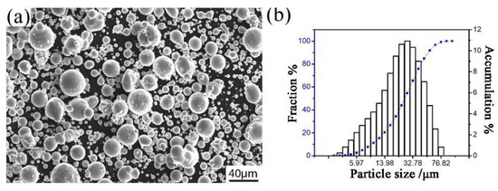 Gas atomized Al–Fe–Cr–Ti alloy powder was produced in the Central South University and was used as the raw material for this research. The chemical composition of the aluminum alloy powder is shown in Table 1. The morphology of the powder is shown in Figure 1a, which shows that particles in the powder exhibit a nearly spherical shape. Figure 1b shows the particle size distribution of the atomized aluminum alloy powders. The median diameter of the powder particle is 25 μm.