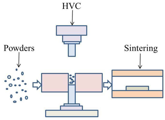 In our previous experiment, we introduced a comparison between single impacts and multiple impacts. The single impact showed to achieve a higher green density for the Al alloy. Therefore, green samples from a single impact were selected for the sintering experiment. During HVC, the hammer and upper punch (driven by hydraulic power), traveling at speeds of 5.0–9.4 ms−1, impacted the powder and applied a very large force to the powder to produce densification. The die-wall lubricant adopted zinc stearate dissolved in acetone before powder filling in the die to decrease the friction between the particles and the die wall and facilitate the ejection of the samples. The die diameter was 25 mm, and the filling height was kept at 15 mm. A total of five specimens were produced in each group at each compaction velocity. Cylinder samples with a diameter of 25 mm and a height of 8.4–9.5 mm were obtained.
