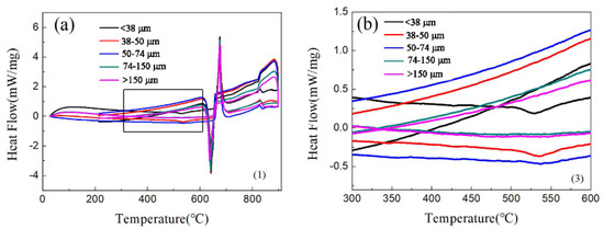 Figure 3 is the DSC of the aluminum alloy powder. Figure 3a shows a major endothermic peak at ~655 °C, which demonstrates that the melting point of the alloy is 655 °C. The experimental sintering temperature was 640 °C. Therefore, it was not liquid phase sintering. At 530 °C, particles with a particle size of fewer than 50 μm have an exothermic peak, as shown in Figure 3b. Figure 3b shows that there is a Q-phase decomposition at 530 °C in the small particles. During the sintering process, the Q-phase decomposes because of the high temperature, and then the phase will increase with an increase in temperature. Galano et al. [31] found that the Q-phase decomposition temperature of Al-based matrix/γ-Al2O3 nanocomposites varied from 503 °C to 551.6 °C with the powder milling time. The different values reported for the decomposition temperature could be related to the different process, and solute contents, such as the Ti-content retained in the Al matrix [18].