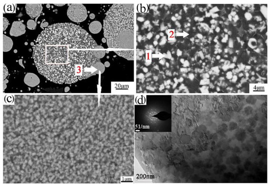 The SEM (scanning electron microscope)/BSE microstructure of the transverse section of atomized powder (a,b); FESEM (field emission scan electron microscope)/BSE micrographs of the fine powder particle (c); bright field TEM (transmission electron microscope)/BF micrographs of the fine powder particles (d).