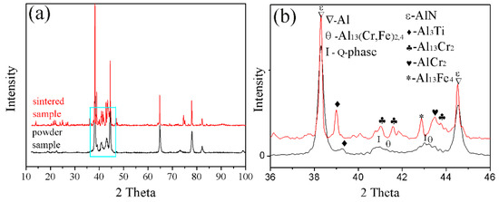 The strength is lower than 600 MPa for the Al–Fe–Cr–Ti alloy in the literature [48]. The main areas of study for this analysis are as follows: (1) The growth of the intermetallic phase, such as Al13Fe4; and (2) decomposition of the quasicrystal phase. The decomposition of the Q-phase during sintering has a detrimental effect on the strength of the Al–Fe–Cr–Ti alloy [39]. These problems are related to the higher sintering temperature, and we will continue to study the sintering process in depth.