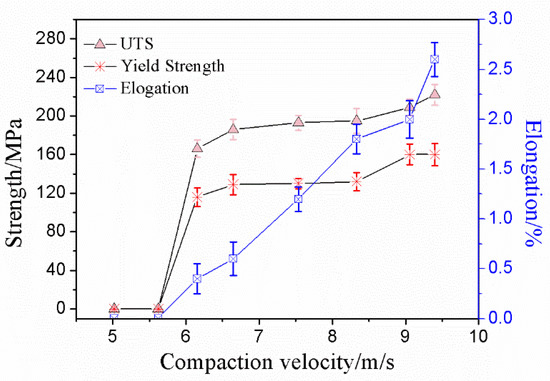 The tensile property of the sintered compacts was measured by using a flat dog bone style tensile specimen. The data of the ultimate tensile strength (UTS), 0.2% yield strength (YS), and elongation are shown in Figure 8. It can be seen from Figure 8 that the ultimate tensile strength and 0.2% yield strength both increased by increasing the compaction velocity, which reached its maximum (UTS 222 MPa, YS 160 MPa) at a compaction velocity of 9.4 ms−1, and the maximum elongation was 2.6%.