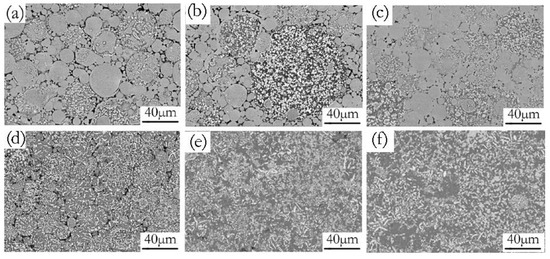 SEM/BSE micrographs of green (a–c) and sintered (d–f) samples under the different compaction velocities (a,d) 6.2 ms−1, (b,e) 7.9 ms−1, (c,f) 9.4 ms−1.
