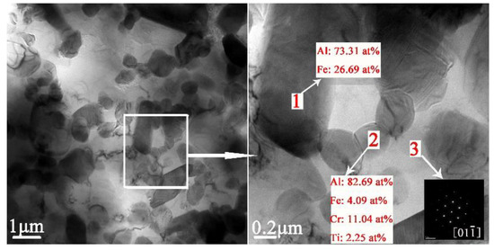 The present study has clearly demonstrated that the phases formed in the green material undergo a transformation during sintering. It is obvious that sintering has a strong influence on the phase formation. XRD patterns of the sintered sample are shown in Figure 5b. These patterns reveal that the phases of the sintered alloy mainly consisted of Al13Fe4, Al13Cr2, AlCr2, Al3Ti, and AlN. Among these phases, Al13Fe4 and Al13Cr2 are produced by the decomposition of the Q-phase in fine particle powders [39]. Pedrazzini et al. [40] and García et al. [39] reported the phases of Al-Fe-Cr-Ti alloy. They thought the phases of this alloy were consist with Al13Cr2, Al13Fe4, and Al3Ti. These results are consistent with our experiments. Vojtech et al. [18] demonstrated the decomposition reaction, as shown in Equation (8). Figure 11 displays the microstructure and the EDS mapping results of the sintered samples of the Al, Fe, Cr, and Ti elements. Figure 11a presents the white needle phases and gray flake phases. The red frame of Figure 11a is further amplified, as shown in Figure 11b. Figure 11b shows a dispersion of small particles. Figure 11c shows the green frame of Figure 11b. The EDS mapping result of Figure 11c shows that the white needle phases are rich in Fe, and the gray flake phases are rich in Ti. The small particles are rich in Cr, which disperse and distribute in the Al matrix. This result is further confirmed by TEM, as shown in Figure 12, where the presence of the spherical small particle phase and the rod phase can be seen. Combined with the EDX analysis results, the higher Cr content of phase 2 is presumed to be Al13Cr2, and the higher Fe content of phase 1 is presumed to be Al13Fe4. Phase 3 is the α-aluminum matrix. Al3Ti is a high melting point compound with good thermal stability [41]. Al13Cr2 hinders the nucleation and growth process of recrystallization, which has a strengthening effect on the alloy and can also improve the toughness of the alloy, thereby reducing the sensitivity of the stress corrosion cracking [42]. AlN is a product of an aluminum alloy that reacts with a protective atmosphere of nitrogen during sintering. This reaction is shown in Equation (9) [43]. This is an exothermic reaction, in which is −318 KJ/mol, and the heat generated by the reaction can locally melt the aluminum alloy and promote sintering. Schaffer et al. [12] also found that this reaction reduced the pore pressure in the pore spaces relative to the external atmosphere, which induced pore filling at grain sizes smaller than those required for sintering in an inert atmosphere. Pore filling is an important densification mechanism during the sintering of aluminum: