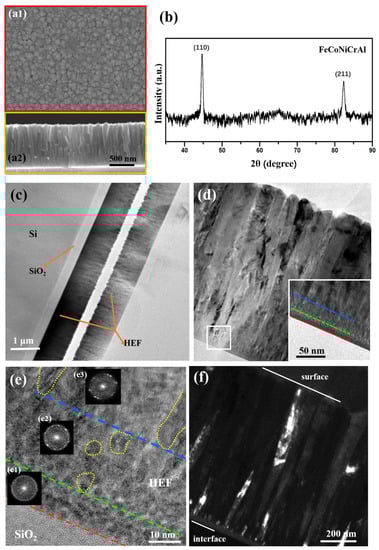 Figure 1f is dark-field TEM image of the film, and the bright areas represent grains with the same orientation. A region with gray contrast existing above the interface, between substrate and HEF, indicates the amorphous structure. Additionally, a lot of bright areas with small sizes represent the equiaxial nanograins. Above the nanocrystalline region, some large bright areas indicate the existence of columnar grains. The regions containing amorphous domains and nanocrystalline structure were also observed in other samples which are not shown here.