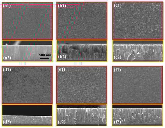 Figure 1(a1,a2), indicating that the sample consists of irregularly-shaped columnar grains. The in-plane grains have polygon morphology and the statistical grain size is 92 ± 26 nm. The columnar crystal structure is confirmed by the cross-sectional image and the top of the columnar grains has angle shape. The thickness of the film is 978 ± 5 nm.