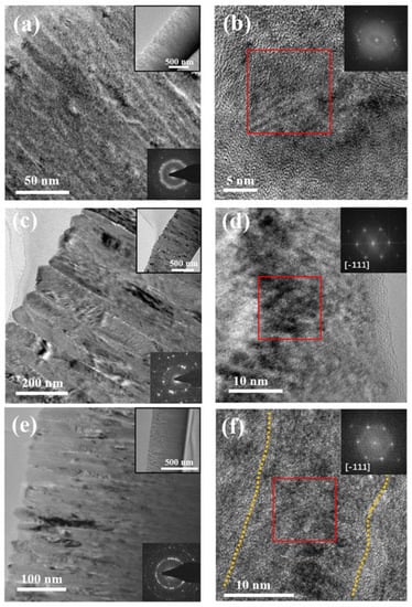 Figure 3f) of the red box area indicates that the crystal orientation is [−111] and the columnar grain has a perfect single crystal structure. Meanwhile, the grain boundaries between columnar grains are clearly observed, marked by the dotted line. The edge profile of the columnar grain is more smooth than that of sample #4. These results clarify that HEF sample deposited using a power of 100 W with the substrate temperature of 350 °C has a good-crystallinity structure with small grain size.