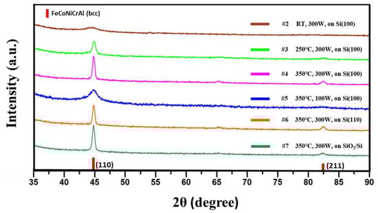 Figure 4 illustrates the XRD patterns of the HEF samples prepared with different parameters. All of the spectrums emerge an easy-to-observe peak, which has the position of 44.6°, indicating the formation of bcc-structured FeCoNiCrAl phase with (110) plane in the film. Besides, samples #3, #4, #6 and #7 also have a small peak at the position of 82.3° representing the bcc-structure FeCoNiCrAl phase with a (211) plane. The XRD results illustrate that all the film samples have a preferred orientation of [110] with single bcc structure, which is different from the FeCoNiCrAl high entropy alloys prepared by other methods having mixed phase structures [