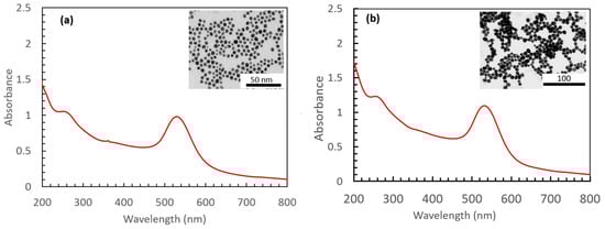 UV-Visible spectra and inset TEM images of the spherical gold nanoparticles synthesized by citrate reduction: (a) 15 nm-gold nanoparticles (AuNPs)@citrate and (b) 30 nm-AuNPs@citrate. Optical path length: 1 cm.