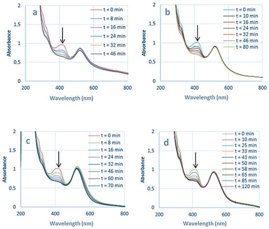 Temporal evolution of the UV-visible spectra of deaerated aqueous solutions containing 5 × 10−4 M sodium thiosulfate and 5 × 10−4 M potassium hexacyanoferrate: (a) in the presence of 15 nm Au-NPs@citrate under irradiation at λ = 520 nm; (b) in the presence of 15 nm Au-NPs@citrate in the dark; (c) in the presence of 30 nm Au-NPs@citrate under irradiation at λ = 520 nm, and (d) in the presence of 30 nm Au-NPs@citrate in the dark. Optical path length: 1 cm.
