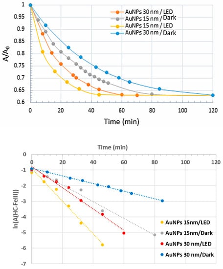 The redox potential of the couples involved in this reaction are E0(Fe(CN)63−/Fe(CN)64−) = +0.36 V and E0(S4O62−/S2O32−) = +0.08 V versus the normal hydrogen electrode at 25 °C []. Although thermodynamically favorable, this reaction needs to be catalyzed. Solutions containing HC-FeIII and ST (without Au-NPs) are stable at room temperature, even under irradiation, while in the presence of Au-NPs and in the absence of irradiation, the reaction takes place, as shown by the disappearance of the absorption bands at 310 and 420 nm associated to HC-FeIII (Figure 2). The rate of the reaction depends on the size of the Au-NPs (Figure 3). Catalysis is a surface phenomenon. Higher reduction kinetics are obtained with smaller gold nanoparticles, which exhibit a much larger surface area and more sites of low coordination (edges and corners), which are important in catalytic steps. Considering the average size of the nanoparticles (15 and 30 nm), and assuming that they are quasi-spherical, their specific surface areas are 14.5 m2 g−1 and 7.3 m2 g−1. In agreement with Mulvaney’s study [], the catalyzed reaction is first order with respect to HC-FeIII, as evidenced by the plot of the logarithm of the absorbance of HC-FeIII versus time (Figure 3, bottom), and the deduced values of the rate constant are 0.0534 and 0.0244 min−1 for the 15 nm and 30 nm AuNPs@citrate, respectively.