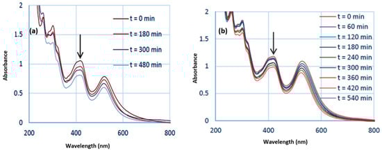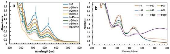 Temporal evolution of the UV-visible spectra of deaerated aqueous solutions containing 5 × 10−4 M potassium hexacyanoferrate under LEDs irradiated at 520 nm (a) in the presence of 15 nm Au-NPs@citrate and (b) 30 nm Au-NPs@citrate. Optical path length: 1 cm.