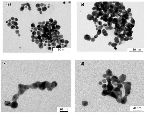 TEM images of initial 30 nm Au-NPs@citrate taken at different times of irradiation during the reduction reaction of hexacyanoferrate (III) by sodium thiosulfate under irradiation with a Xe lamp equipped with a cutoff filter at 450 nm: (a) before irradiation; and after (b) 30 min; (c) 120 min; and (d) 180 min of irradiation.