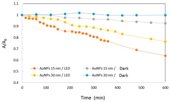 Notably, the temperature increased in the solution during the reaction under irradiation and stirring was only 3–4 degrees, as measured by a thermo-couple immersed inside the reaction cuvette. Under continuous irradiation, each NP contributed to the global warming of the solution they were surrounded by. As the irradiation was continuous, and considering the NPs’ size, light power, stirring, and irradiation duration, the thermal gradient in the vicinity of each NP was negligible, so the local overheating effect can be disregarded []. Consequently, the increase of temperature due to plasmon excitation is not enough to favor the reduction power of citrate.