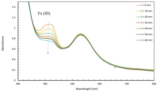 Figure 9 presents the spectral evolution of a deaerated solution containing HC-FeIII and 15 nm Au-NPs@citrate under irradiation by a Xe lamp with a longpass filter at 450 nm. As in the case of the LED irradiation (Figure 8), a decrease in the absorbance of the bands at 310, 420, and 520 nm is observed, but this decrease is much faster since, after 3 hours, the bands are almost vanished. However, a comparison between Figure 4a and Figure 9 indicates that the presence of ST accelerates the spectral evolution recorded under Xe lamp irradiation and, consequently, accelerates the reaction. Even without ST, however, reshaping and precipitation due to the aggregation of Au-NPs@citrate continue to proceed.