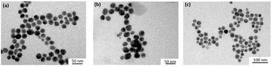 TEM images of the initial 15 nm Au-NPs@pNTP taken at different times during the reduction reaction of hexacyanoferrate (III) under LED irradiation at 520 nm: (a) 10 min; (b) 30 min; and (c) 60 min of irradiation.