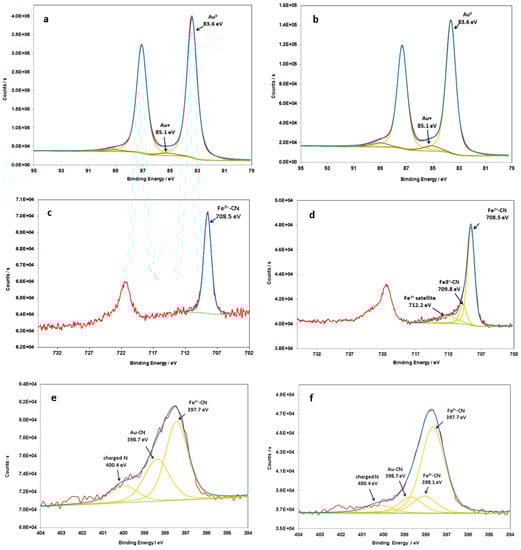 XPS spectra of the Au4f (a,b), Fe2p (c,d), and N1s (e,f) core levels of 30 nm-Au-NPs@citrate after reaction under LEDs irradiation at 520 nm (during 60 min) for deaerated solutions containing hexacyanoferrate (a,c,e) with or (b,d,f) without sodium thiosulfate.