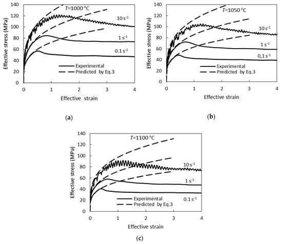 Experimental hot torsion flow curve determined at (a) 1000 °C, (b) 1050 °C, and (c) 1100 °C and curve predicted by Equation (3).