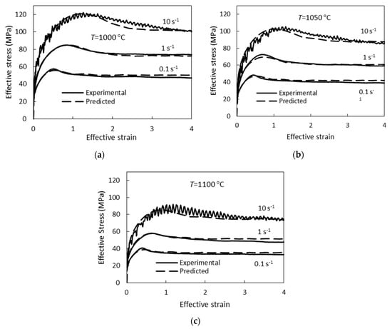 Comparison between the experimental and predicted flow curves determined at (a) 1000 °C, (b) 1050 °C, and (c) 1100 °C.