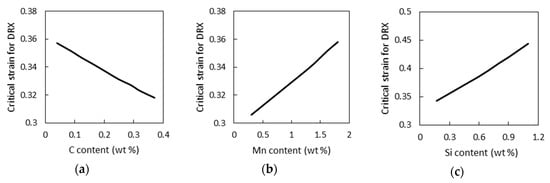 The influence of the content of (a) carbon, (b) manganese, and (c) silicon in low-alloyed steels on the critical strain for dynamic recrystallization.