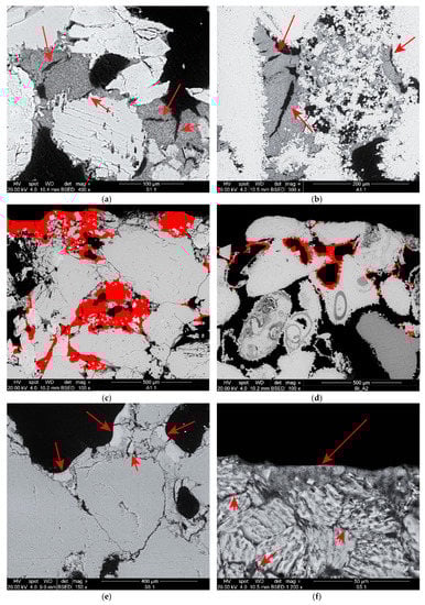 In the sandstone samples, unreacted DAP crystals were observed after treatment with neat DAP (Figure 3b), probably because of the limited amount of calcium ions, only available from the dolomitic fraction of the natural cement. It is possible that conversion to HAP did not reach completion and that residual DAP crystals were not completely removed by the rinsing. Differently, the combinations of DAP and nanosuspensions promoted the conversion reaction, producing a homogeneous Ca-P phase with abundant shrinkage cracks (Figure 2e,f). The consolidant formed bridges up to 20 μm wide, as well as a tightly-adhered Ca-P layer around the surface of the grains. As for consolidation with the nanosuspensions, the porosity of the interstitial clay matrix was preferentially filled over bigger pores.