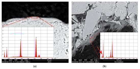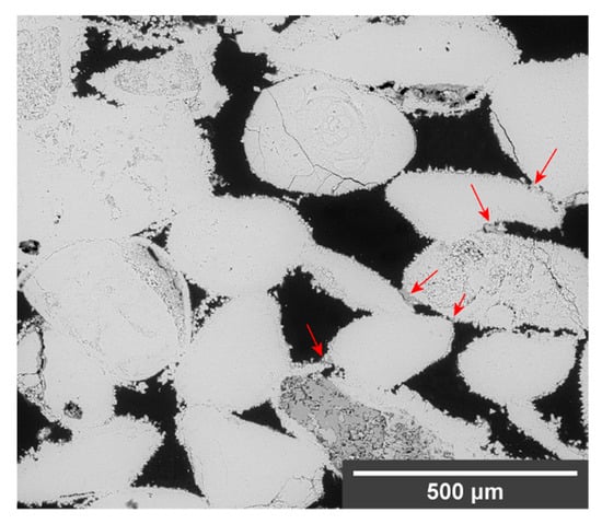 The combination of DAP with the nanosuspensions promoted bridges formation and penetration. The nanomaterials reached about 1 cm depth from the surface (Figure 5), in comparison with the few millimetres penetration obtained after the use of the neat products. In the treated limestone, two consolidation effects were observed: The first one entailed the formation of a layer similar to the one observed after treatment with neat DAP, characterised by a compact texture and a Ca:P ratio of about 1:1. The second one entailed the formation of small bridges with a more porous structure and a composition richer in calcium. These different consolidation effects were likely a consequence of the consolidants’ distinct behaviours: while DAP required conversion into HAP to accomplish a consolidation effect and was limited by the presence of a calcium-rich substrate, the nanosuspensions tended to form toroidal bridges between the stone grains upon the carrier evaporation. Furthermore, after treatments with NC-DAP, some of the bridges showed a granular texture. This was possibly a result of the reaction between DAP and the CaCO3 nanoparticles that, being dispersed in an aqueous medium, may have acted as nucleation centres for the newly formed Ca-P phase [].