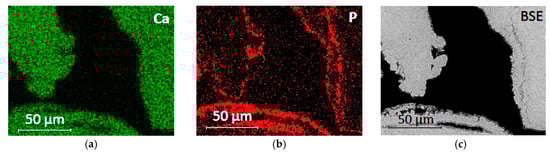 The chemical composition of the phosphate-based consolidant was verified by EDX analysis, which revealed that Ca, P, and O were the dominant elements of this layer. The relative elemental maps are shown in Figure 4 together with the BSE image of the same area. The phosphate layer was found to be evenly distributed, up to about 2 cm in depth from the consolidated surface.