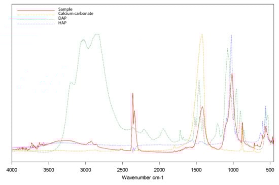 To corroborate the conversion of the applied DAP into HAP, the spectra were compared with the reference spectra of calcium carbonate, DAP and hydroxyapatite, as shown in Figure 7. Although the results suggest that the DAP conversion took place in all analysed samples, previous studies suggested that the reaction products were most probably a mixture of HAP, octacalcium phosphate and other insoluble precursors [,]. According to the same studies, these compounds are expected to eventually transform into the most thermodynamically stable HAP through a series of dissolution and reprecipitation processes. Clear identification of these phases was hindered by the wide overlapping of their characteristic bands with those of the substrate. Furthermore, the precipitation mechanisms of hydroxyapatite and related precursors are complex and not yet fully understood, and their identification can be challenging not only by FT-IR spectroscopy but also using other techniques [].