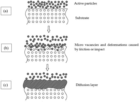 Chemical heat treatment is usually used to improve the corrosion resistance, high-temperature oxidation resistance and hardness of metal parts [21,22,23,24]. However, due to the high temperature and long production time, it not only consumes a lot of energy, but also affects the mechanical properties of parts. Therefore, the Mechanical Energy Aided Diffusion Method (MEADM) that emerged in recent years has become an attractive metal materials anti-corrosion technology in the field of material surface strengthening. The MEADM, developed by the addition of mechanical energy (rotation, vibration, friction, etc.) in the traditional solid pack-cementation process, achieves the purpose of reducing the preparation temperature required and shortening the preparation time. As such, the MEADM develops rapidly. There are three steps in the MEADM as shown in Figure 1: (a) with the assistance of mechanical energy, the active powder particles in the diffusion agent rub and impact the surface of the heated substrate, resulting in micro vacancies and plastic deformation on the substrate surface; (b) the active particles enter the generated vacancies or adsorb into the deformed surface to form a surface solid solution or an intermetallic compound, forming an initial diffusion layer; (c) a dense protective diffusion layer is achieved by adsorbing the active particles in a continuous fashion.