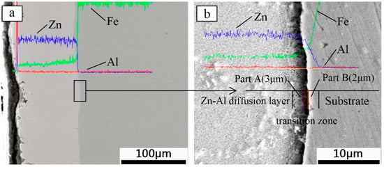 On observation of Figure 2b, there is a transition zone with a thickness of 5 μm at the interface between the Zn-Al diffusion layer and the substrate. The content of Zn and Fe in the transition zone changes abruptly. The content of Zn reduces to almost 0. The Fe element content remains constant after a sharp increase. The transition zone is divided into two parts. The first part (Part A) is close to the Zn-Al diffusion layer and has a thickness of 3 μm. The other part (Part B) is close to the substrate and has a thickness of 2 μm. This part is formed by the diffusion of Zn into the substrate. A small number of pores (average diameter 0.6 μm) are found at the boundary of the transition zone by the SEM image. These pores are caused by a small amount of entrained air that cannot be discharged in time when the diffusion element permeates into the substrate. This is attributed to the fact that the ambient preparation temperature is not stable and the substrate temperature is low at the initial stage of the Zn-Al diffusion layer growth.