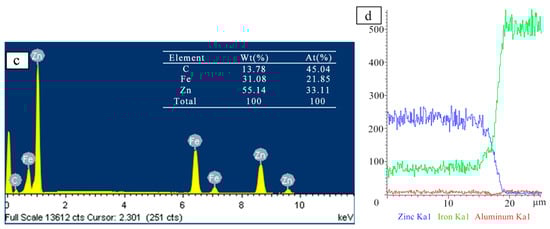 Figure 2 shows the SEM images and corresponding Energy Dispersive Spectroscopy (EDS) spectra of the Zn-Al diffusion layer in cross section. Figure 2b is an enlarged image of the rectangular area in Figure 2a,c,d are EDS spectra of the Zn-Al diffusion layer. It can be found that the main elements of the diffusion layer are Zn, Al, and Fe. After the Al powder is diffused by the MEADM at 450 °C, a high Al content is only detected near the diffusion layer surface, which indicates that the Al layer with a thickness of 2–4 μm is mainly present in the superficial layer. In the vertical direction of the Zn-Al diffusion layer, the content of Zn changes little, and the overall content shows a slight downward trend, whereas the content of Fe increases slowly.