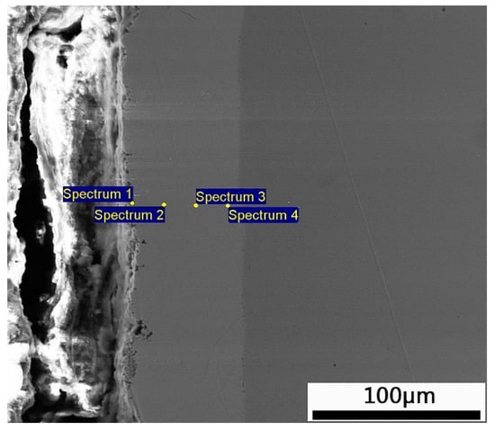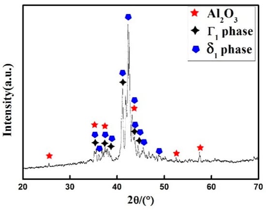 Figure 3 shows the XRD patterns of the Zn-Al diffusion layer. It is found that Al2O3 and Zn-Fe alloys of Γ1 phase (Fe11Zn40) and δ1 phase (FeZn6.67, FeZn8.87, FeZn10.98) are mainly formed in the Zn-Al diffusion layer. Combined with SEM images and EDS spectra, the element ratios at positions 1, 2, 3, and 4 in Figure 4, are shown in Table 2. The Zn-Fe content ratios (WZn:WFe) are 10, 8.2, 8.4, and 6.4, respectively. According to XRD patterns, the Zn-Fe alloy near the surface of the Zn-Al diffusion layer is mainly FeZn10.98, the Zn-Fe alloy near the boundary between the diffusion layer and the substrate is mainly FeZn6.67, and the Zn-Fe alloy in the middle area of the diffusion layer is mainly FeZn8.87.