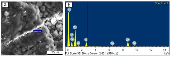 Figure 7 depicts the microscopic corrosion topography and EDS spectra of the Zn-Al diffusion layer after immersing for 360 h and ultrasonic cleaning for 10 min. The corrosion topography show that the metal powder on the Zn-Al diffusion layer surface is actively dissolved, and the flocculent corrosion products deposit on the surface, covering the entire surface. The energy spectrum analysis of the filler in the surface crack of the diffusion layer is shown in Table 4. In addition to the elements of O, Al, Fe, and Zn, the Cl element which is the main element causing corrosion is detected. It indicates that the filler in the surface crack is corrosion products produced by Cl− corroding in solution. After ultrasonic cleaning, the corrosion products are still present in the crack, indicating that the corrosion products are firmly bonded to the Zn-Al diffusion layer. The firmly combined corrosion products fill the crack to help block the intrusion tunnel of the corrosive medium, which can slow down the corrosion rate of the Zn-Al diffusion layer and improve the protection ability for the substrate [35,36].