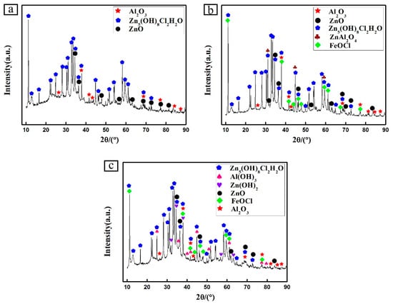 XRD patterns of the Zn-Al diffusion layer corrosion products during salt spray corrosion: (a) 168 h; (b) 480 h; (c) 1000 h.