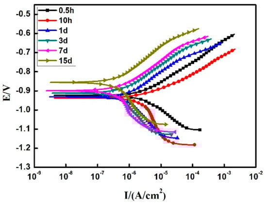 Figure 10 depicts the potentiodynamic polarization curves of the Zn-Al diffusion layer in 3.5 wt. % NaCl solution for different immersion times, and Table 5 shows the corresponding polarization curve fitting data. Through the polarization curve analysis, it is found that as the immersion time is prolonged, the self-corrosion potential of the Zn-Al diffusion layer increases significantly, but the self-corrosion current density decreases by an order of magnitude. In other words, the corrosion rate of the Zn-Al diffusion layer decreases with the prolongation of immersion time in a certain time range.
