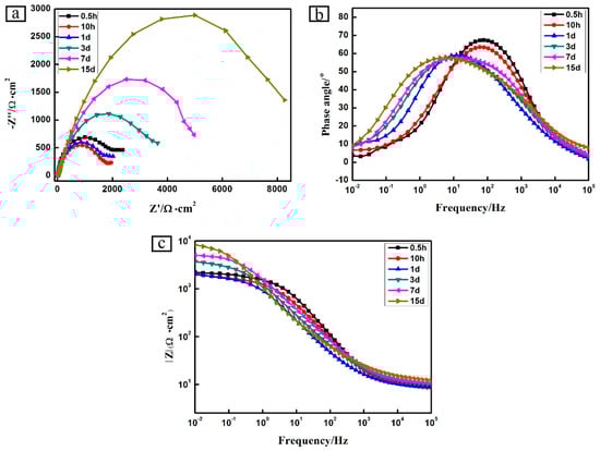 EIS spectra plots of different immersion time of the Zn-Al diffusion layer: (a) Bode impedance modulus; (b) Bode phase angle; (c) Nyquist.