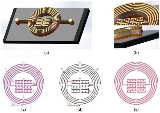 Established with GaAs-based IPD technology, a compact BPF comprising two intertwined quasi-circular inductors and a centrally embedded capacitor was developed with three metal layers, as demonstrated in Figure 1a. Air-bridge structures can be clearly observed in the outer inductor, and an enlarged 3D view of the air-bridge and the three metal layers are shown in Figure 1b. Furthermore, the 2D views of each layer are illustrated in Figure 1c–e, namely: leads, text, and bond from top to bottom in the design and simulation software (Advanced Design System (ADS) 2016). The dimensional parameters of each layer are listed in Table 1, in which the leads and bond layer feature the same dimensions. The width of the conductor coils and the gap between them are set as the minimum manufacturing size to miniaturize the overall size, and the thickness of each layer is also decided by the fabrication. The inner radius is set as 250 μm to embed the central capacitor, and so the distance between the capacitor and the inductor are wide enough to avoid the mutual effects. The number of turns, or the length of the inductor, is estimated via the established equivalent model according to the operating frequency after the inner radius is fixed.