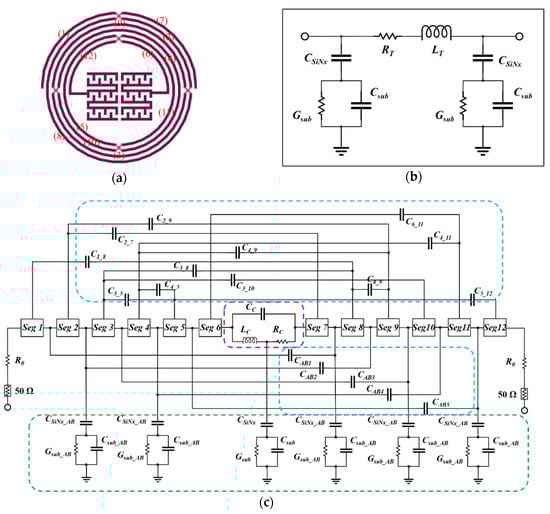 To evaluate the equivalent circuit accurately, an analytical model for estimating the performance during the design process of the proposed BPF was developed based on the segment method, the mutual inductance approach, and simulated scattering parameters (S-parameters) [,]. As illustrated in Figure 2a, the lumped model comprises four parts after considering the parasitic effects under high frequency excitation: the segment of the metal line without overlap (Seg i), the coupling capacitor between metal tracks out of the segment, the parasitic effects induced by the SiNx passivation layer and the GaAs substrate, and the central capacitor.