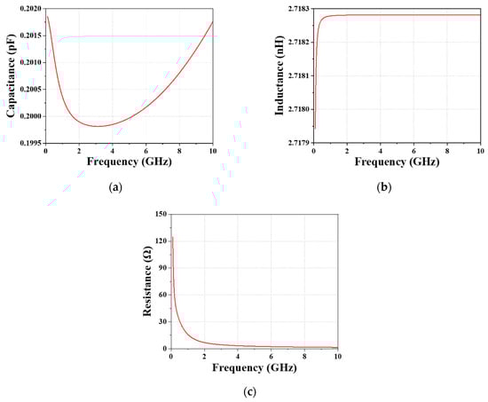 Considering the ohmic losses and the inductive effect, the central embedded capacitor is modeled by three components: a capacitor (CC), an inductor (LC), and a resistor (RC). However, the frequency-dependent parameters of the capacitor are difficult to calculate due to the complicated construction. Hence, the simulated S-parameters and the Y-parameters are applied to calculate the capacitance, inductance, and the resistance from the given formulas. In addition, the capacitance can be tuned to match the design target via tuning the dimension of the central capacitor. The values of these three parameters of the final designed capacitor varying with frequency in the range of 0–10 GHz are shown in Figure 3. Finally, on the basis of the calculated total inductance and capacitance, the operating frequency can be estimated.