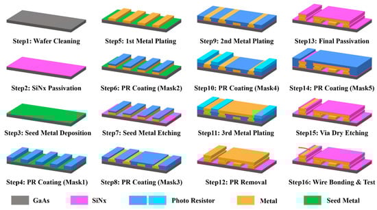 IPDs are manufactured using standard wafer fabrication techniques with thin-film and photolithography processing, which enables integration of the discrete passive electronic components into a chip [,]. An improved IPD fabrication method based on a GaAs substrate was developed in previously reported work by our group. In addition, these components, comprising a NiCr thin-film resistor, spiral inductor, and metal-insulator-metal capacitor, were implemented for the advantages of high quality, high yield, and cost effectiveness []. Many blocks, such as the power divider, coupler, and balun, have been developed on the basis of improved manufacturing flow [,,]. The proposed BPF comprising two intertwined spiral inductors and a central embedded capacitor was developed with a total of 16 steps and 5 masks in this study, and the fabrication flow is illustrated in Figure 4.