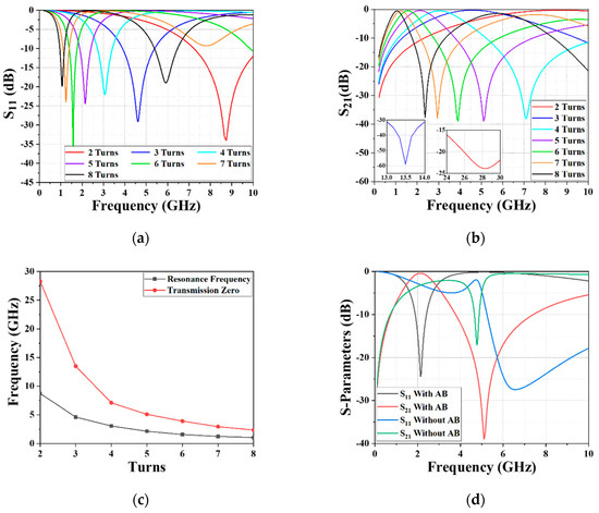 Factors such as the overall size, insertion loss, and bandwidth are important for the performance evaluation of a BPF, and the controllability of the CF and TZ is an additional factor in evaluating a BPF device. Our previous work reported the impact of the varying inner radius, conductor gap, and conductor width []. To further investigate the controllability of the proposed IPD-based BPF, the effects of the altering turns of the outer inductor and various metal thicknesses on the RF performance were analyzed via the simulation software. Figure 5a,b illustrates the trails of the reflection coefficient (S11 parameter) and transmission coefficient (S21 parameter) with varying inductor turns in the range of 2–8, respectively. It can be obviously noted from Figure 5a that the CF shifted to a lower frequency with the increasing inductor turns; the TZ presents the same shifting trend as the CF, as revealed in Figure 5b. The functional relationship of the CF and the number of turns is shown in Figure 5c, indicating that the CF increases exponentially as the number of turns decreases, rather than having a linear relationship. In addition, the comparison of the intertwined inductor with/without air-bridge structure is illustrated in Figure 5d, demonstrating that differential construction with air-bridge structure improves the performance in the L-band and S-band.