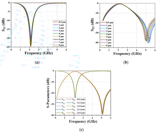 Figure 6 shows the variation caused by altering the metal thicknesses of the different layers, in which the leads and the bond layer always have the same thickness. Figure 6a demonstrates the effects of the varying metal thicknesses of the leads and bond layer on the S11 parameter when the metal thickness of the middle layer was fixed at 1.8 μm, indicating that the CF barely changed with the increasing metal thickness in the range of 0.5–8 μm. However, the insertion loss at the CF increased when the metal thickness was lower than 2 μm, which is interpreted as the strengthened resistance resulting from the metal thickness being lower than the skin depth of copper at 2 GHz. The skin depth of copper is approximately equivalent to 1.48 μm, as can be calculated from Equation (17):