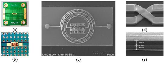 (a) Packaged BPF on the printed circuit board; (b) enlarged view of the wire-bonded BPF; (c) SEM figure of the top view of the BPF; (d) enlarged view of the air-bridge area; (e) cross-section of the device using the GaAs-based IPD technology.