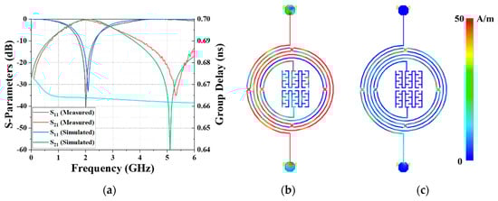 As depicted in Figure 8a, the CF of the simulated and measured results operates at 2.09 GHz and 2 GHz, respectively, and a TZ is located at the right side of the passband with the frequency of 5.1 GHz and 5.32 GHz, respectively. The insertion loss at the CF and TZ of the measured results are 0.38 dB and 35.15 dB, respectively, achieving a low loss pass in the passband and good out-of-band isolation. Additionally, the group delay is also simulated, and is shown in Figure 8a [,]. The current density distribution at the CF and TZ are shown in Figure 8b,c, validating the excellent passband performance and out-of-band restraint. Moreover, the implemented BPF features an ultrawide passband from 1.387 GHz to 2.822 GHz with a 3-dB FBW of 72.53%. As a significant figure of merit (FoM) of BPF, the quality factor is calculated using the simulated Y-Parameters as 32.2 [,,]. The performance comparison of the proposed IPD-based BPF with recently published work, based on various manufacturing technologies, is given in Table 3, which exhibits the advantages of the low insertion loss, wide passband, and miniaturized size of the GaAs-based IPD technology. Furthermore, the comparison of this work GaAs-based IPD with other BPF using different GaAs-based technologies is shown in Table 4, showing the IPD-based device possess the merits of ultra-wide passband and low insertion loss with similar dimension.