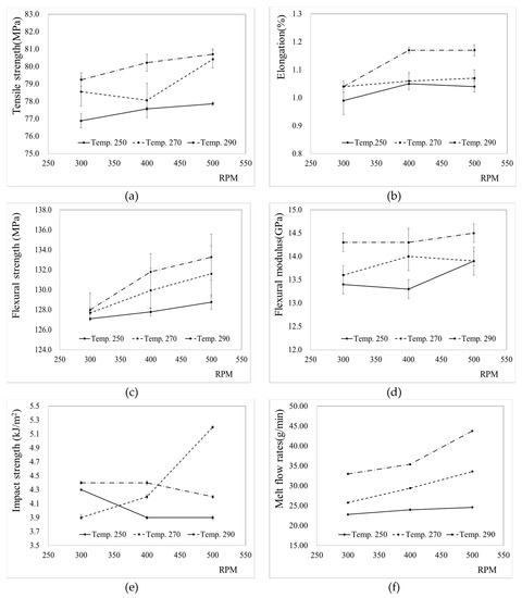 The impact strength is plotted in Figure 1e, as a function of RPM for various temperatures; however, no significant trend was found. With increasing RPM, the impact strength at 250 °C and 290 °C decreased, while that at 270 °C increased.