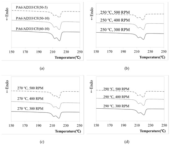 In semi-crystalline polymers, the crystallization behavior of the matrix has a significant influence on the physical properties of the corresponding composites [30,43,44]. DSC analysis was carried out to determine the crystallization and melting properties according to the change in RPM and temperature. Table 5 outlines the enthalpy changes according to the conditions. In addition, Figure 3a shows the melting curves with various compositions and Figure 3b, c and d show the DSC thermograms according to temperature and RPM during heating for each sample fabricated in this study. Semi-crystalline polymers can exhibit multiple melting endotherms which are generally attributed to the melting of imperfect crystals formed during the crystallization or different crystal types depending on the presence of specific fillers. Multiple melting behaviors have also been reported for PA6 and its composites in related studies [30,45,46,47,48]. As is well known, c-phase crystals are preferred at higher cooling rate, while the a-phase crystals dominate in slow cooling rate [30,49], and the two crystal forms are melting at about 215 °C (γ-form) and 225 °C (α-form), respectively. We can conclude that the double melting endotherms in the PA6 composite were probably caused by two different crystal structures. The peak temperatures during heating ranged from 219 °C to 221 °C. The Total melting enthalpy (ΔH) was calculated from the Tm. Degree of crystallinity (Xc) was calculated according to Equation (1). It is easy to find that the Xc was increased as the fillers increased. It can be concluded that CF and Al2O3 will restrict or block the movement and arrangement of PA6 chains, leading to more imperfect crystals and lower crystallinity. The change of Xc value with the change of content was observed, but it was difficult to find a meaningful change of Xc value with the change of process conditions.